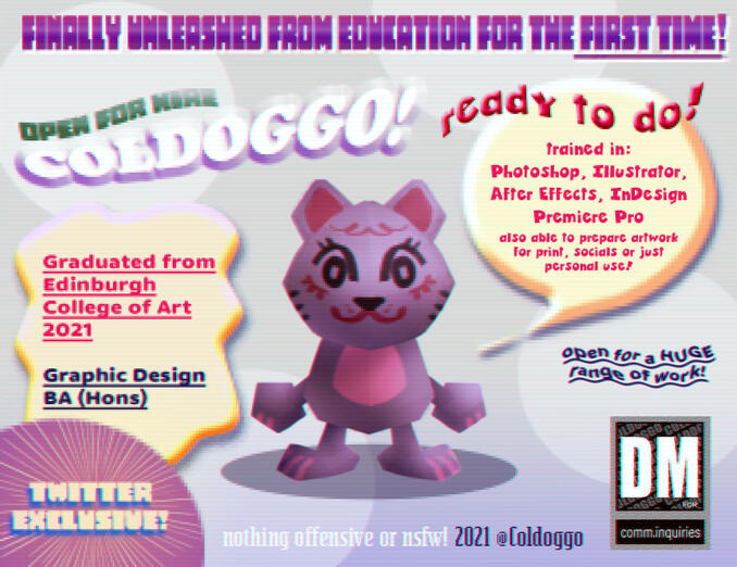 graphic design work (logos, t-shirts, posters, ads, fake products etc)art commissions (for individuals, couples, groups of homies or brands)stuff for socials (icons, banners, pinned tweets)work for 'tubers such as vtuber rigs, youtuber intros, twitch streamer brb screens anything u need baybeemerch for individuals, small brands, 'tubers, charities, good causes etc